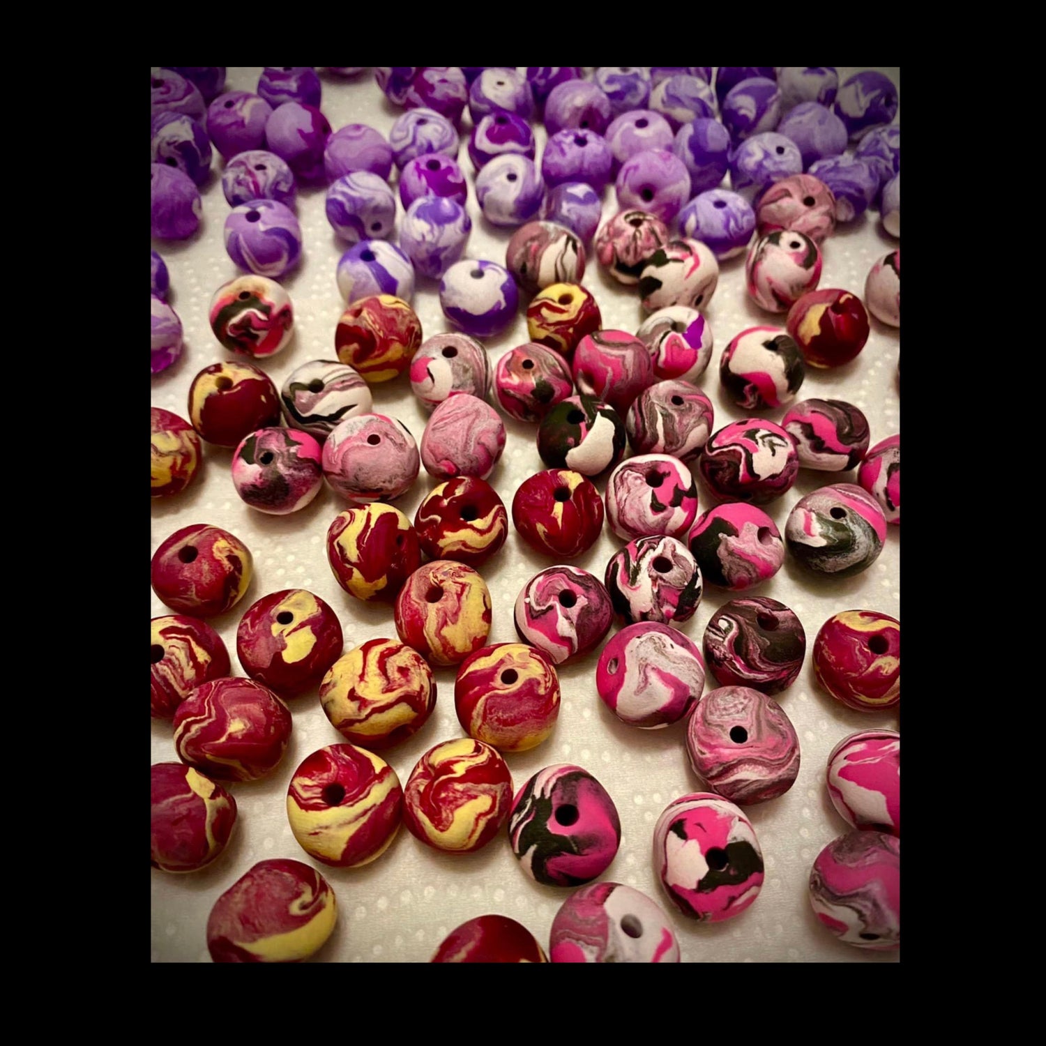 Bracelets and earrings are made with one-of-a-kind, handcrafted, polymer clay beads. The artist uses a clay blending technique before firing, which results in a unique design coloration for each bead. No two beads are exactly alike! The beautiful clay beads are then paired with various other beading materials such as: glass, metal, wood, or synthetics. The result is an exclusive adornment that will not be duplicated.