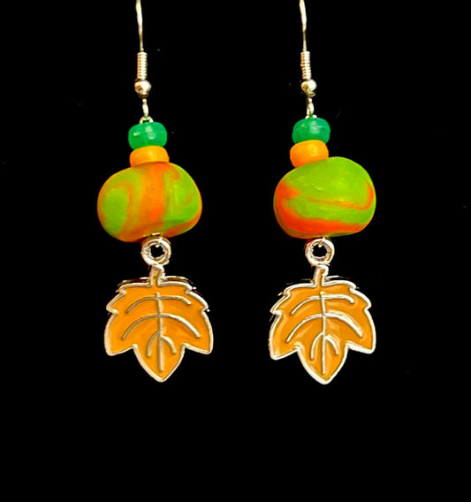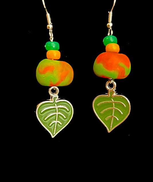 Earring - Orange and Green Foliage - Made with Handcrafted Clay Beads