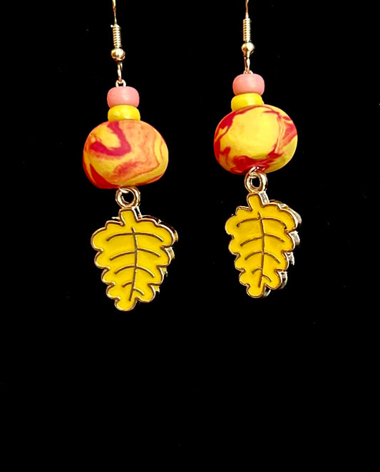 Earring - Pink and Yellow Foliage - Made with Handcrafted Clay Beads